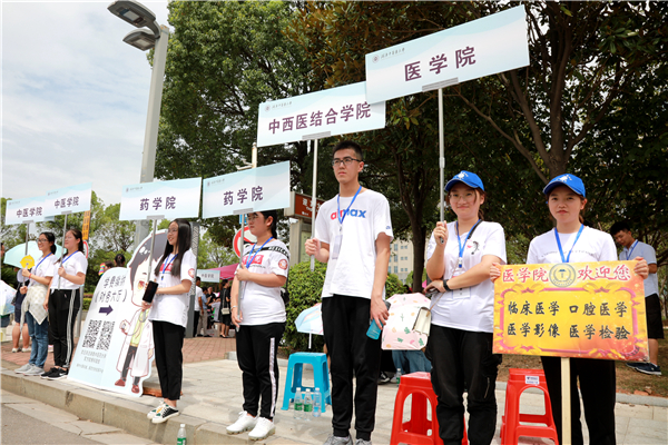 与湖中大相遇的第一天,步履匆匆,心潮澎湃。清晨6时许,第一辆满载新生的班车抵达含浦校区,迎接他们的是早已等候多时的各院系的老师和志愿者们。学生区整齐排开的迎新帐篷,仲景路上拉起的渐变色条幅,主干道上迎风飘扬的五星红旗,都在向新生们致以最亲切的问候:“欢迎你,湖中大的新主人!”