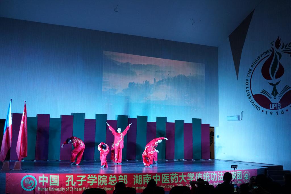 菲律宾国立大学孔子学院外方院长Lourdes Nepomuceno博士致欢迎词。她对巡演团和莅临现场观看演出的观众表示热烈欢迎并表示,湖南中医药大学的演出将中医与武术、养生相结合,一定能让菲律宾民众耳目一新。