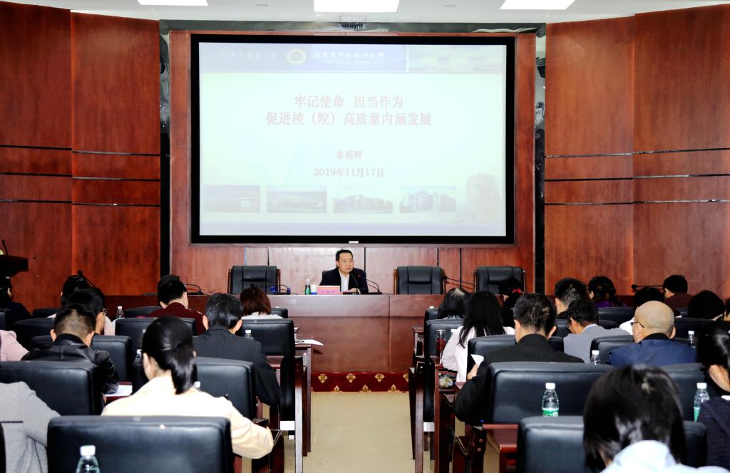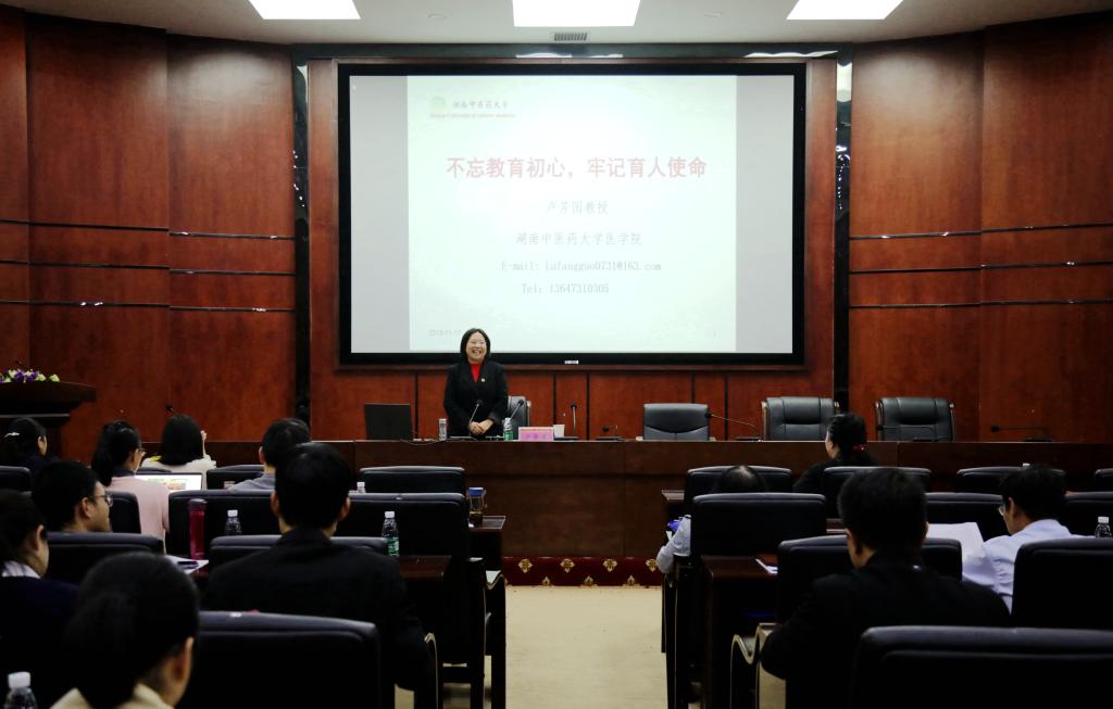 开班仪式结束后,秦裕辉作了《牢记使命,担当作为,促进校(院)高质量内涵发展》的主题讲座。他分享了习近平总书记关于教育、中医药工作的重要论述,解读了全国中医药大会精神,从湖南省以及校(院)两个层次分析如何把握机遇,贯彻落实《关于促进中医药传承创新发展的意见》、传承创新发展中医药,指出要在“坚持中西医并重”总方针的前提下,牢牢把握发展方向、发展要领、发展重点三大关键。他希望大家肩上要有“一面旗”,胸中要有“一座山”,手中要有“一把剑”,案头要有“一把尺”,成为“学高、德高、艺高”“爱教、善教、能教”的具有“传道”能力和“弘道”精神的一流师资队伍,为学校建设发展提供更加坚强有力的人才支撑!