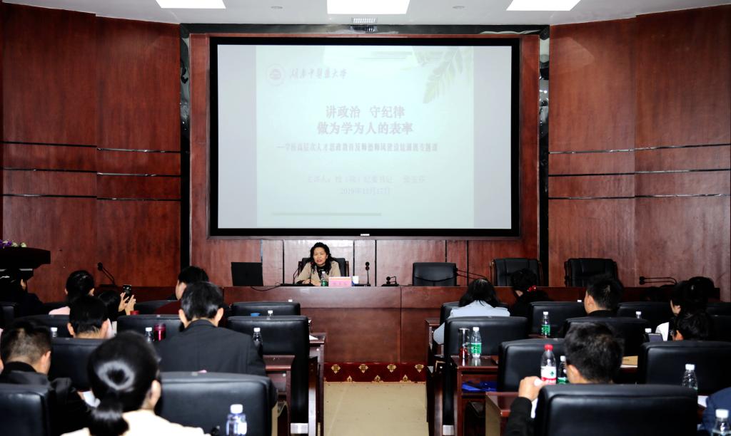 11月17日,我校在国际教育学院学术报告厅举行“不忘初心修师德,牢记使命塑师风”为主题的高层次人才思想政治教育及师德师风建设高级研修班。校(院)党委书记秦裕辉、副书记肖小芹,校(院)党委委员、组织人事部长廖菁,湖南省“百人计划”专家、湖南省“121”创新人才培养工程人选、湖南省高层次卫生人才“225”工程培养对象、湖南省青年骨干教师培养对象等高层次人才80余人参加了培训。开班典礼由廖菁主持。