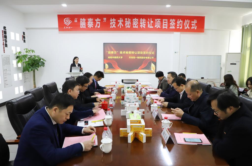 11月20日上午,“脑泰方”技术秘密项目转让签约仪式在天地恒一制药股份有限公司二楼会议室举行。校(院)党委书记秦裕辉、副校长葛金文,天地恒一制药股份有限公司董事长王衡新、总经理邓俐丽、常务副总经理宋志林等参加签约仪式。葛金文、邓俐丽分别代表湖南中医药大学、天地恒一制药股份有限公司共同签署《“脑泰方”技术秘密转让协议书》,标志着我校(院)在科研成果转化上取得了新的突破。