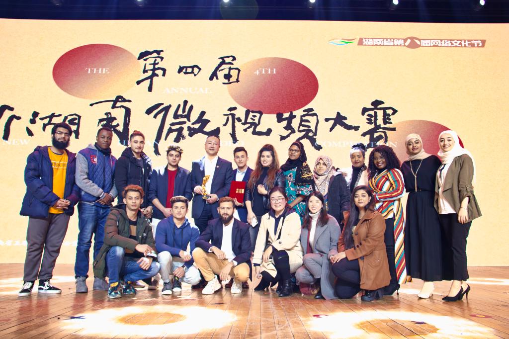 12月24日,由湖南省人民政府新闻办、湖南省委网信办、湖南广播电视协会等单位联合举办的湖南省第八届网络文化节“新湖南微视频大赛”颁奖典礼在长沙举行,我校原创微视频《明日歌》摘得“海外最佳创意奖”。国际教育学院院长王军文与留学生贾思德代表我校领奖。