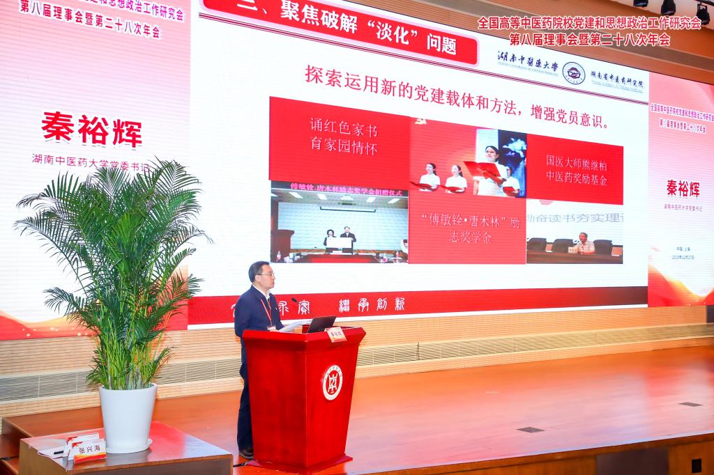 在大会闭幕式上,秦裕辉作为第二十九次年会承办单位作表态发言。他表示,明年正值我校本科办学60周年,欢迎各理事单位、各兄弟院校来湖南中医药大学交流、指导工作。在理事会的坚强领导下,学校将结合湖南的红色资源优势,以寻找共产党员的初心使命为主线, 以上海的成功经验为借鉴,举全校之力办好大会。