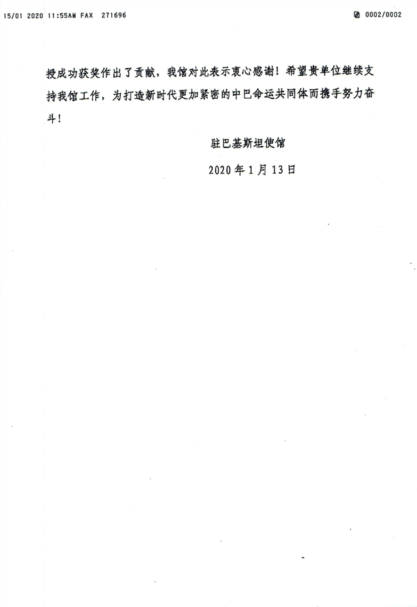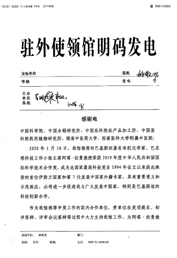 1月13日,中国驻巴基斯坦大使馆向我校发来感谢电,感谢我校在奖项提名、初评答辩、评审会议答辩等过程中对大使馆工作的大力支持,感谢我校对阿塔拉曼教授成功获奖做出的贡献。
