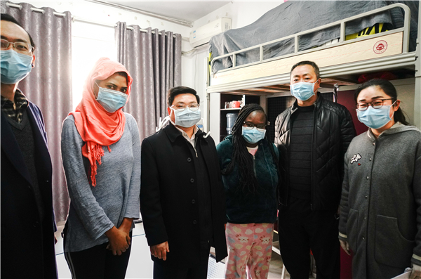 戴爱国第一站到了国际教育学院。寒假期间200余名留校学生均为来华留学生,学校每日对留学生公寓、食堂、楼道、走廊、电梯等区域用艾叶、酒精做好清洁和消毒工作。国际教育学院在春节之前集中采购了一批口罩、体温计提供给留学生使用,并对宿舍进行严格管理,实行每日签到,外出登记制度。戴爱国走进来自加纳的留学生幸运和蒂娜的宿舍,叮嘱同学们加强体育锻炼,科学做好防护。