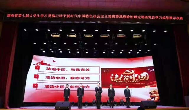 新湖南客户端12月7日讯(通讯员 黄汀 龙斌)12月4日,由省教育厅主办的湖南省第七届大学生学习贯彻习近平新时代中国特色社会主义思想暨大学生思想政治理论课研究性学习成果展示竞赛决赛(本科组)在湖南女子学院举行。由湖南中医药大学马克思主义学院教师龙斌、成波指导,2021级英语2班学生邱余琦、胡志杰、艾浪平、肖湘、陈俊杰组成的研究性学习小组,以《法治中国.与我同行——新时代大学生法治精神培养研究》为主题进行了展示,并荣获一等奖。