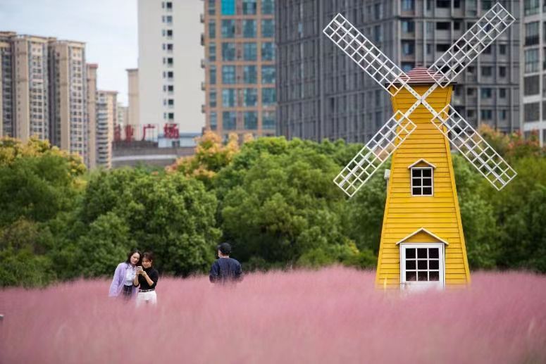 10月10日,学生们在粉黛乱子草草丛中游玩。