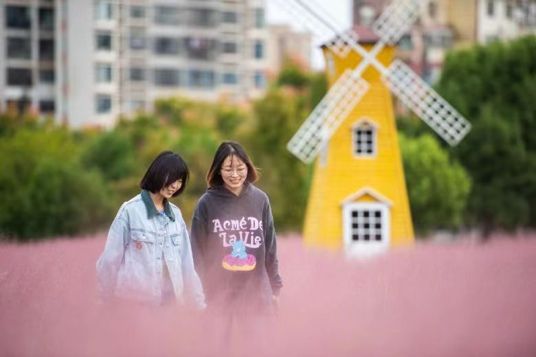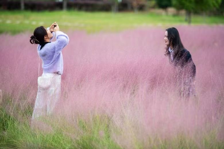 10月10日,学生们在粉黛乱子草草丛中拍照、游玩。