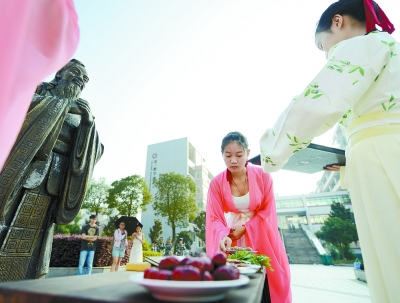 9月10日,湖南中医药大学校内,学生们身着汉服,按传统礼仪奉上戒尺和“春雨茶”,献上芹菜、莲子、红豆、枣子、桂圆、干瘦肉条等组合成的束脩六礼,用这种特别的方式祝福老师教师节快乐。