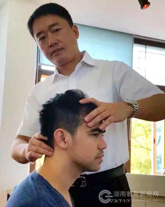 湖南中医药大学国际交流与合作处处长、针灸推拿学教授李江山在给一名菲律宾学员作按摩示范。