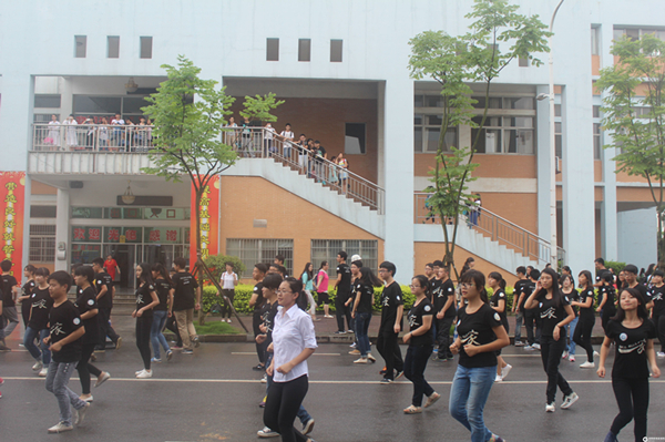 音乐声起,百余名身着学院统一服装的同学们从校园各处奔出,组成一个方阵,跳起了舞蹈。舞毕,齐声喊道:“追梦管工,多彩人生。”