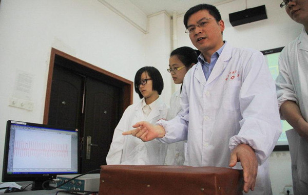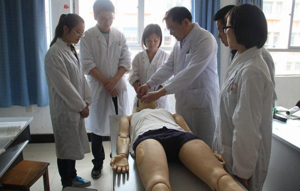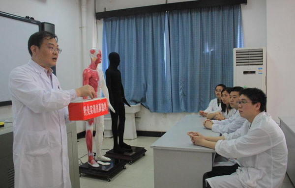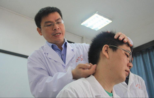 湖南中医药大学针灸推拿学院院长李铁浪教授为毕业生讲解推拿手法。