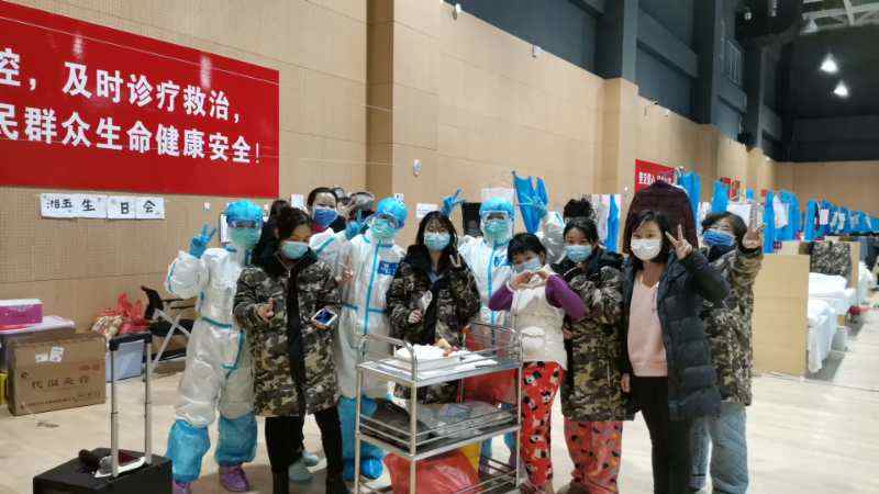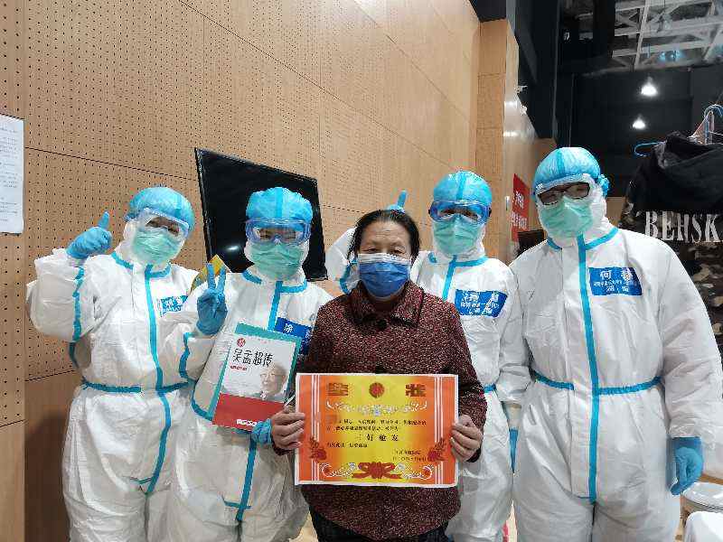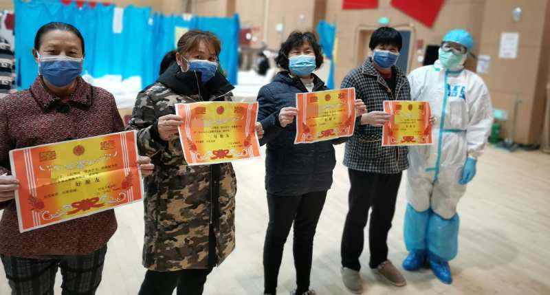 2月28日下午5点半, 武汉江夏方舱医院湖南队负责的“湘五”病区,湖南中医药大学第一附属医院护士长涂丽、尹罗娟等医护人员为几个住院的阿姨颁发了“三好舱友”奖状。