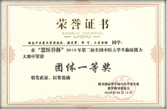2019年第二届全国中医大学生临床能力竞赛一等奖