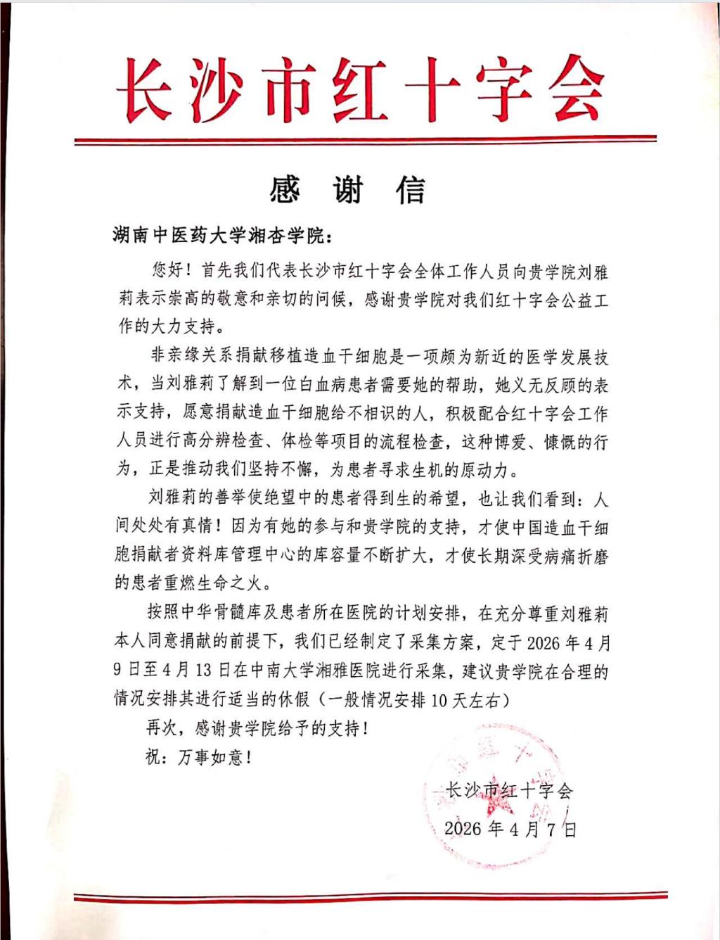 作为一名护理专业的学生,刘雅莉同学对“生命”二字有着比同龄人更深刻的理解。在大一期间,她通过参与校内爱心献血活动加入了中华骨髓库。2025年11月,刘雅莉同学收到长沙市红十字会配型成功通知,得知与一名血液疾病患者初步配型相符后,毫不犹豫地同意捐献,并全程积极配合完成血液高分辨配型检测和体检,确认了其捐献资格。经过一系列安排与协调,在中南大学湘雅医院进行了造血干细胞采集。在捐献过程中,刘雅莉同学始终保持乐观积极的心态,直言“哪怕疼一点,也要帮到底!”,用实际行动诠释了新时代医学生的责任与担当。长沙市红十字会特向学院发来感谢信,高度赞扬刘雅莉同学的博爱善举,对学院支持公益事业表示感谢。