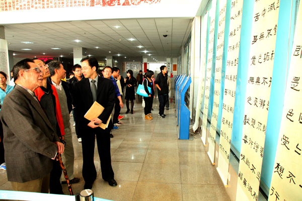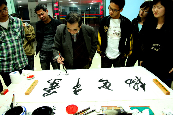11 月28 日下午,第三届“三湘读书月”系列活动之书法艺术赏析会在图书馆举行。著名书法家杨炳南老先生应邀来我校讲学,并就师生的书法作品进行了点评、与书法爱好者进行了交流。