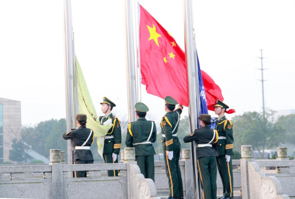 七点整,英姿飒爽的国旗仪仗队护卫着国旗、大学校旗和研究院院旗走到国旗台前,他们步履铿锵,在嘹亮的国歌和悠扬的校歌中将旗帜徐徐升起,在场师生共唱国歌、行注目礼。