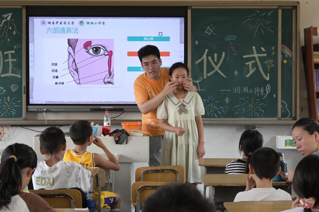 今年暑假,“湖湘小仲景”团队再次出发,为益阳市南县浪拔湖镇中心小学的乡村儿童带去了医药文化夏令营。中医药科普、小儿推拿、八段锦......课程表排得满满当当。