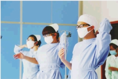 2012级涉外护理班,刘震(右)是为数不多的男生之一。