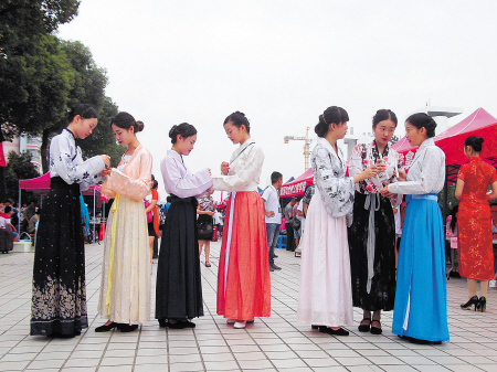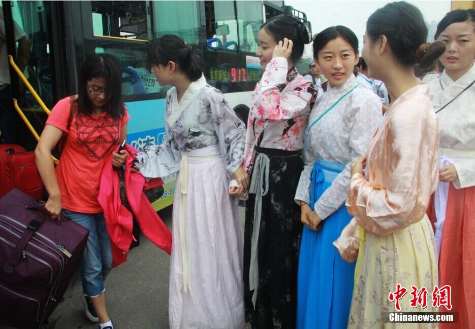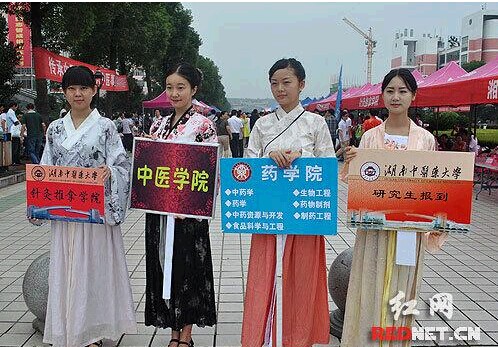 身着汉服的女学生 身着传统汉服,向新生展示银针艾条……昨日上午,在湖南中医药大学首日迎新现场,一支特殊的汉服迎新队伍,向前来报到的新生和家长展现了传统中医药特色文化。