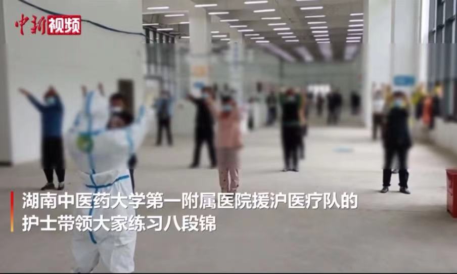 中国新闻网:【上海战疫】湖南援沪医疗队护士带领方舱病人练“八段锦”