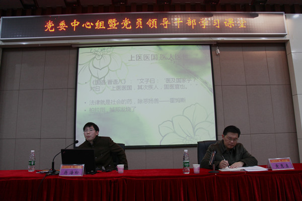 1 月 2 日下午 ,学校举行党委中心组学习暨党员领导干部学习课堂,邀请湖南大学法学院院长助理、春风公益发起人、湖湘人文读书会会长蒋海松博士主讲《湖湘文化与法治湖南:契合与反思》的主题讲座。