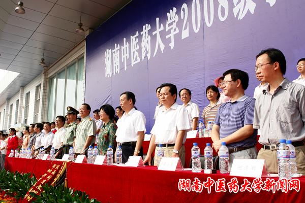党委副书记陈弘(右二)、副校长谭达全(左二)出席动员大会 军训动员现场 9 月 7 日 上午,湖南中医药大学 2008 级新生军训动员大会在含浦校区体育馆隆重举行。