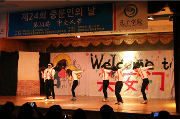 舞蹈《小苹果》 合影 11月15日,我校孔子学院和韩国圆光大学中文系联合举办的圆光大学第24届“中文人节” 在圆光大学人文学院一楼的剧场举行。