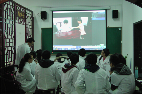 学生在认真观看模拟就诊视频 学生在分组讨论病案 肖碧跃老师观察学生分组讨论情况 中医的生命力在于临床,培养学生临床思维能力是中医院校教育的核心问题。