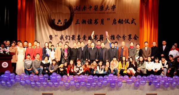 合影 11月17日晚,由我校团委主办的第六届“三湘读书月”启动仪式暨“我们最喜爱的书籍”推介分享会在学生活动中心举行。