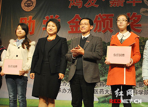 湖南中医药大学校长廖端芳(右二)为受助学生发放助学金。