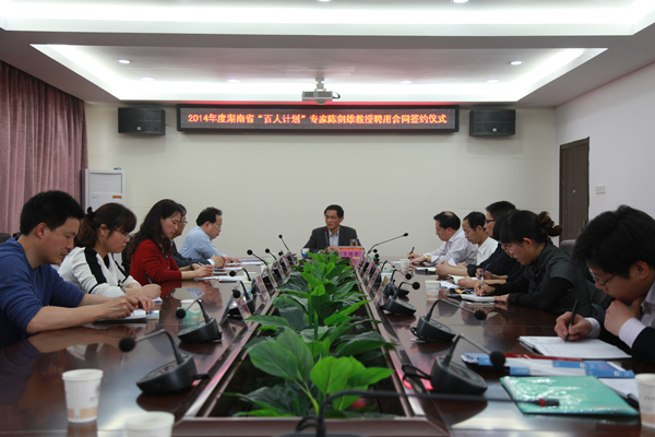 会场 签订聘用合同 颁发聘书 合照 4月17日,我校在含浦校区办公楼二楼会议室与2014年度湖南省“百人计划”专家陈剑雄教授就聘用合同进行签约。