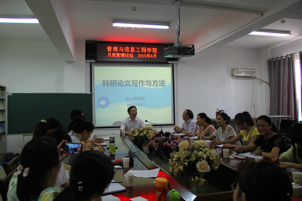 6月23日,湖南省社科院科研处处长陈文胜教授受邀来管理与信息工程学院月度管理论坛开坛讲学,管理系全体教师及研究生均参加了此次论坛。