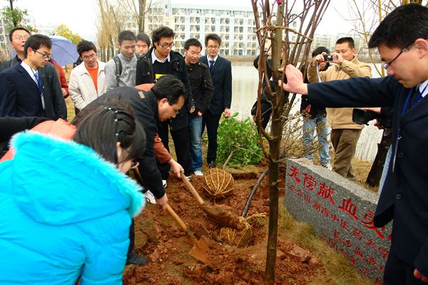 学校领导、长沙血液中心领导与志愿者一同种下爱心树 志愿者热情很高 3 月 12 日 中午,校团委、学社联主办的“ 3.12 植树节活动启动仪式”在含浦校区爱心林举行。