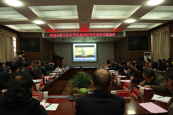 会场 廖端芳致词 胡镜清讲话 于智敏作学术交流 何清湖作学术交流 张涛作学术交流 3月10日,中国中医科学院中医基础理论研究所所长胡镜清、副所长徐世杰一行四十余人来校考察交流。
