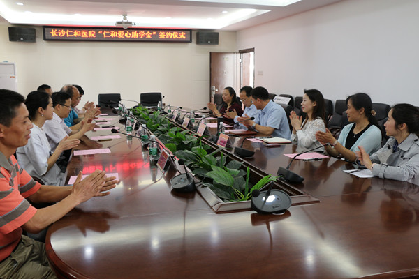 签约仪式现场 大学赠予医院捐资助学纪念铜牌 5月17日上午,我校与长沙仁和医院“仁和爱心助学金”项目签约仪式在含浦校区行政楼二楼会议室举行。