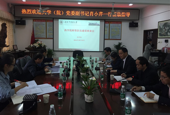 10月13日上午,校(院)党委副书记肖小芹,大学党委委员、组织人事部部长廖菁等到药学院调研师资队伍建设,药学院全体院领导、各科室、平台负责人参加了调研会。