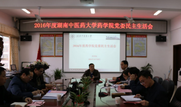 12月28日下午,药学院党委在药学院会议室召开2016年度民主生活会,大学校长、校(院)党委副书记秦裕辉全程参会并讲话,会议由院党委书记张秋雁主持,药学院党政领导班子全体成员参加会议。