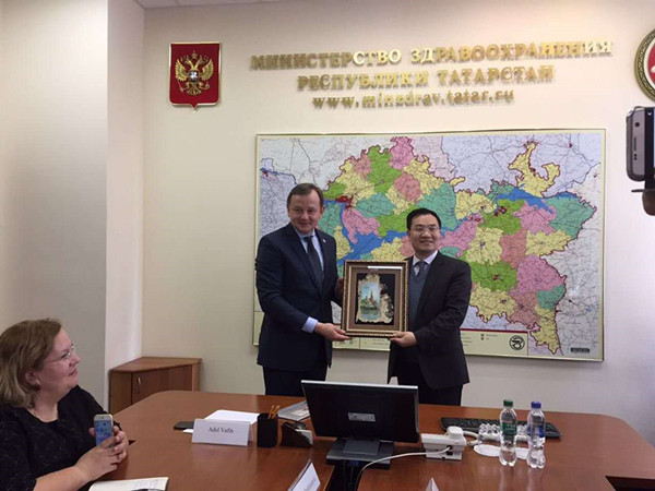 与俄方鞑靼斯坦共和国卫生部长互赠礼品 与喀山国立医科大学签订战略合作协议 与俄罗斯科学院喀山中心附属医院签订合作协议 应俄罗斯科学院喀山中心的邀请,大学校长、校(院)党委副书记秦裕辉率大学第一附属医院...