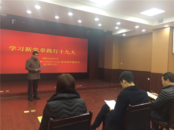 12月20日,直属图书与信息党支部第三党小组联合中国建设银行中医药大学支行、湖大支行举办了“学习新党章、践行十九大”党支部共建活动,共有党员25人参加了此次活动。