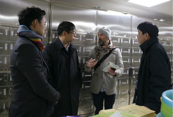 PETER FRANKLIN(左三)、ROBERT PEIKWEN(左一)在附二院中药房参观 12月14日,毕业于美国耶鲁大学的《世界地理杂志》编辑PETER FRANKLIN、摄影师ROBERT PEIKWEN到我校附二院采访。