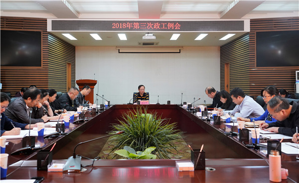 4月18日上午,校(院)2018年度第三次政工例会在行政楼一楼会议室召开,校(院)党委副书记肖小芹主持会议。
