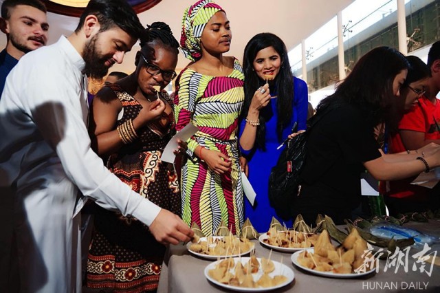 6月12日,外国留学生在湖南中医药大学迎端午游园会上品尝端午粽子。