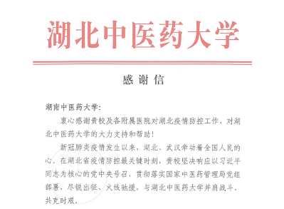 近日,湖北中医药大学向我校发来感谢信,对我校医疗队援助湖北抗击新冠肺炎疫情表示感谢。信中提到:“你们坚定同湖北中医药大学患难与共,让中医药在抗疫中大显身手,为打赢疫情防控阻击战贡献了中医药智慧和力量,为我们战胜疫情注入了强大信心和动力。...