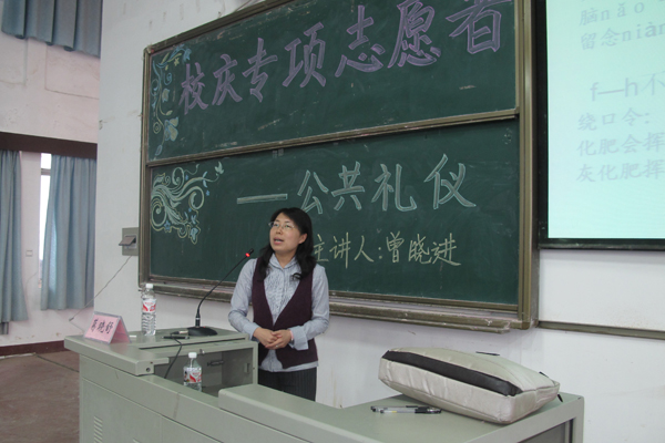 (国家级普通话测试员葛晓舒老师讲解普通话知识与言谈举止) (省级普通话测试员曾晓进老师讲解公共交往礼仪) 5 月 15 日下午,我校校庆专项志愿者第二次培训在我校 1506 教室举行。