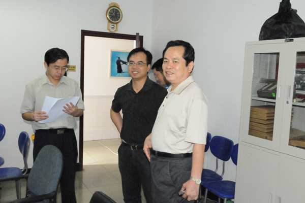 (蔡光先一行查看校史文物资料) (蔡光先一行了解校园人文景观设计方案) 7 月 26 日 ,我校党委书记蔡光先、党委副书记、副校长黄政德、党委副书记陈弘到东塘校区看望 50 周年校庆工作人员。