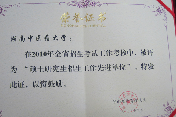根据湖南省教育考试院关于在湘高等院校 2010 年度招生考试工作考核评估结果的通报(湘教考发 [2011]2 号),我校获评 2010 年硕士研究生招生工作先进单位。