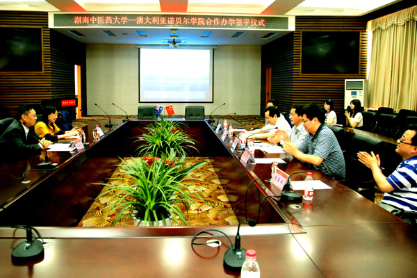 4 月 28 日下午 ,我校与澳大利亚诺贝尔学院合作办学签字仪式在行政楼一楼会议室举行,澳大利亚诺贝尔学院院长张世京先生偕夫人姜春生女士、我校校长廖端芳、研究院党委书记、副校长谭达全出席仪式、校办公室、国际教...