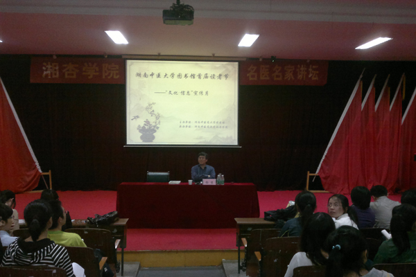 4 月25 日 晚,湖南中医药大学图书馆首届读者节“文化 . 信息”宣传月——“中医是什么 怎样学中医”专题学术讲座在我院东塘校区学术报告厅举行,彭坚教授担任此次讲座主讲。