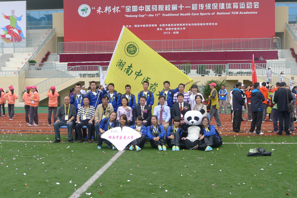 我校代表队和国家中医药管理局领导合影 运动员与学校老师颁奖合影 我校代表队领取八段锦金牌 易筋经项目比赛现场 正值金秋收获的季节,我校于 9 月 23 — 27 日组团参加了在成都中医药大学温江校区体育场举行的...